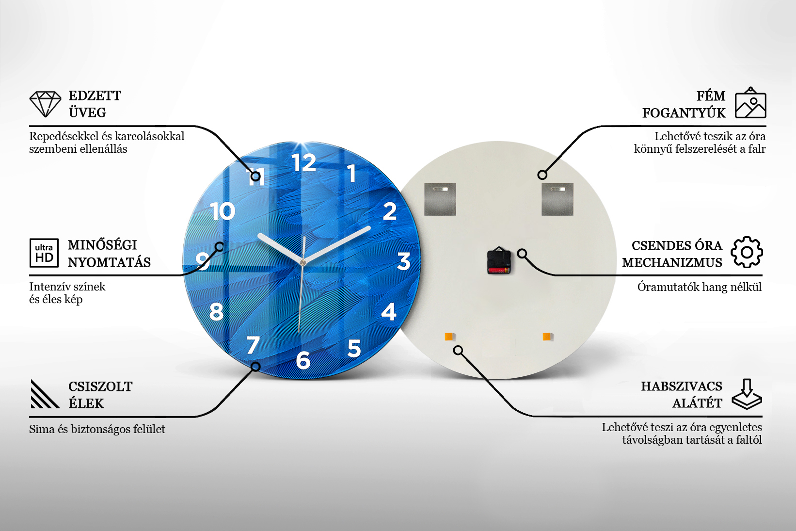Ne feledje, hogy nyomtatott üvegórát vásárol. Az olyan motívumokat, mint a csillogás, arany, ezüst, beton, márvány, rozsdás fémlemez stb. nyomtatják, ezért megjelenésükben eltérhetnek valódi társaiktól.